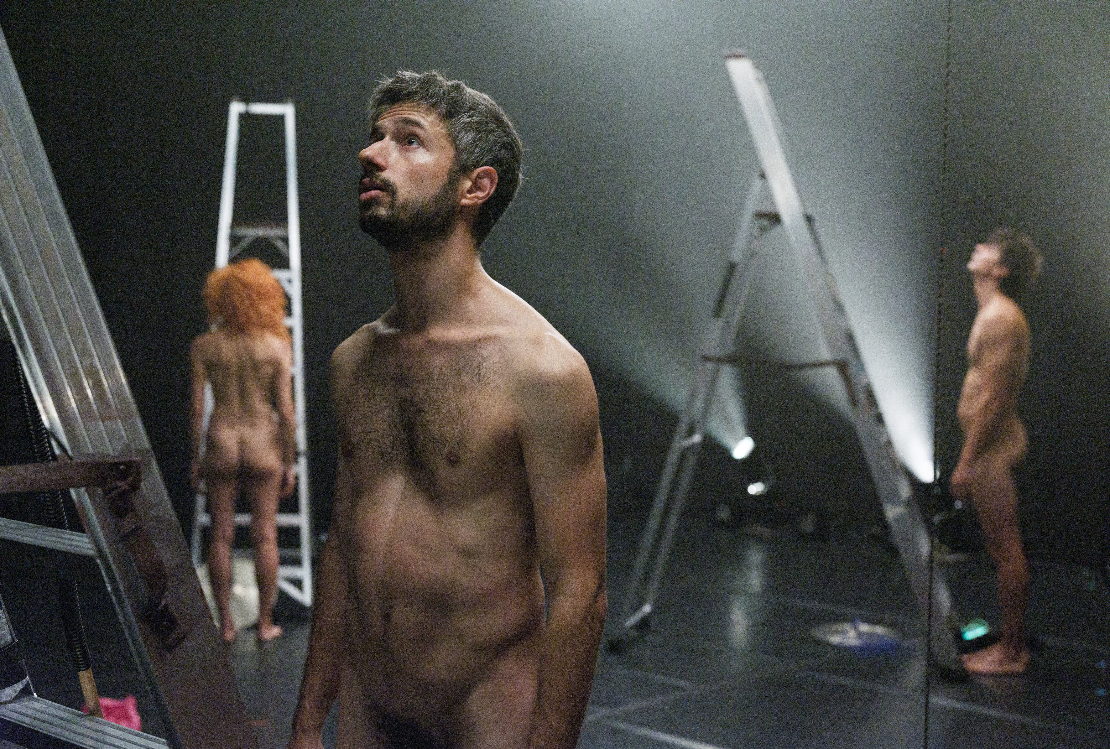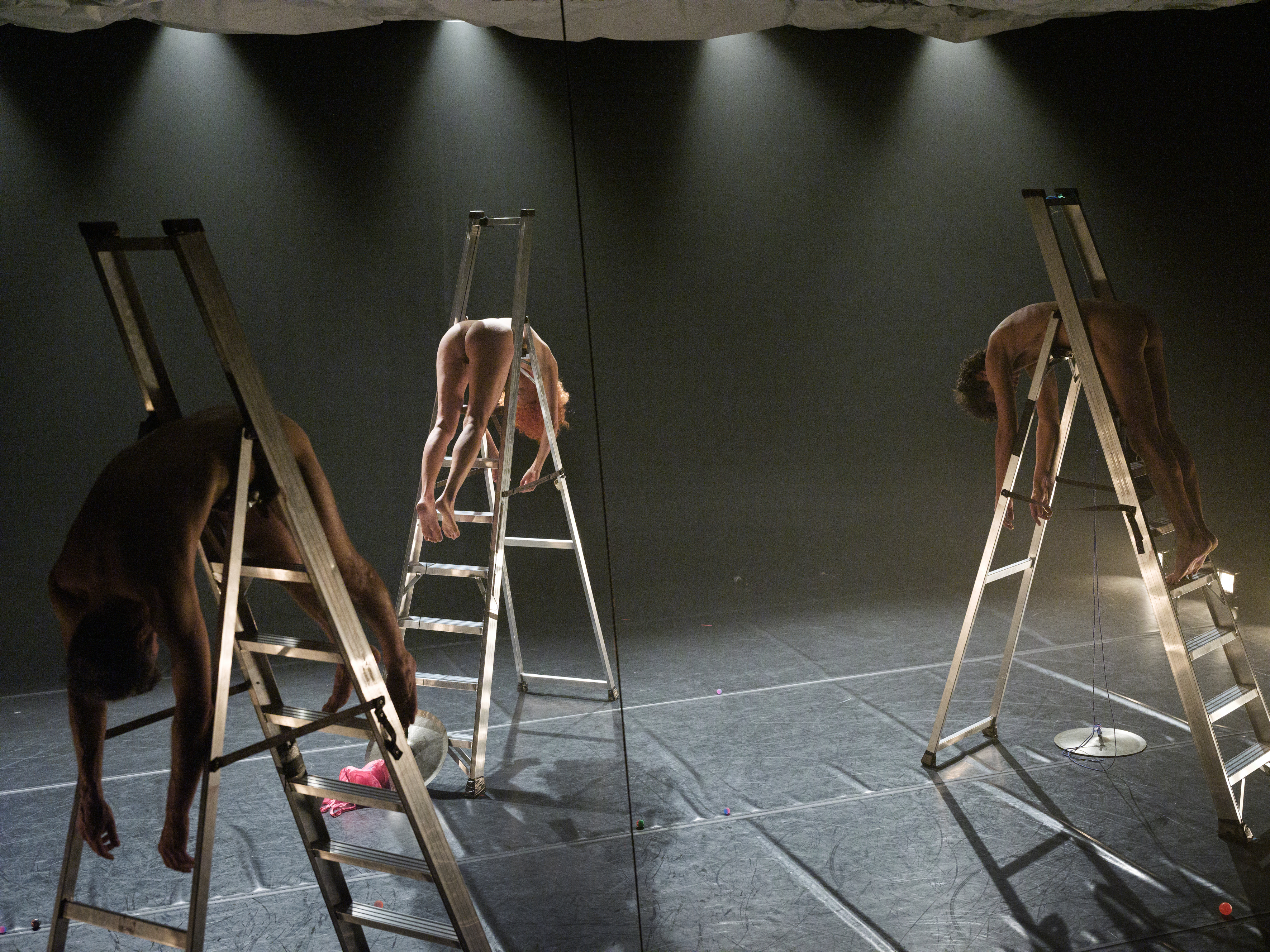 In the first of these micro-pieces, one of the elements present in the scenography of The Fright was replicated, an iron ring about 2 metres in diameter, and the two rings, together with the two performers, became the central protagonists of this austere and practically silent ‘... small exercise’ of synchrony in time and geometry in space. In _groundsky|, another scenographic element from The Fright, but less used in this one, was chosen and also multiplied here, now by three: a ladder. In The Fright, the ladder was used because, symbolically speaking, they wanted to ‘touch the feet of the gods’. In _groundsky| we tried to see what that would actually be like, what it would be like to touch the feet of the gods and hold up the sky, which is falling, as we all know. And so the three bodies now levitate upwards, forcing us to lift our gaze. The action lifts off the ground, the world becomes small below. Three bird-angels wander over our heads, leaving us wondering if they will come down and help us understand the turmoil of the shallow plane.